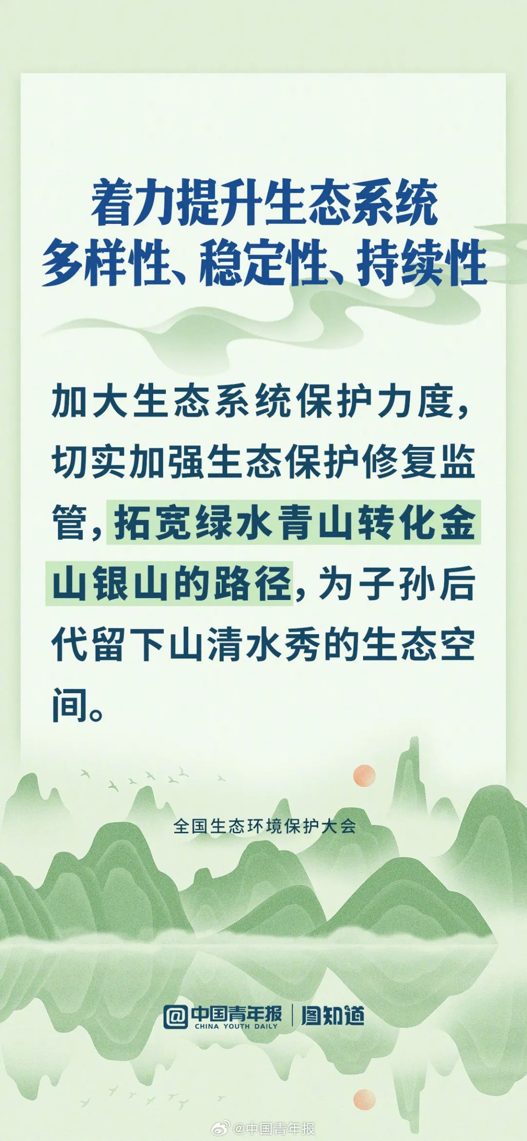 近日舉行的全國生態(tài)環(huán)境保護(hù)大會(huì)指出,今后5年是美麗中國建設(shè)的重要時(shí)期,要把建設(shè)美麗中國擺在強(qiáng)國建設(shè)、民族復(fù)興的突出位置,以更高站位、更寬視野、更大力度來謀劃和推進(jìn)新征程生態(tài)環(huán)境保護(hù)工作。這也是時(shí)隔5年,我國再次召開高規(guī)格生態(tài)環(huán)保大會(huì),布局美麗中國建設(shè)。未來有哪些重點(diǎn)工作,讀圖了解。